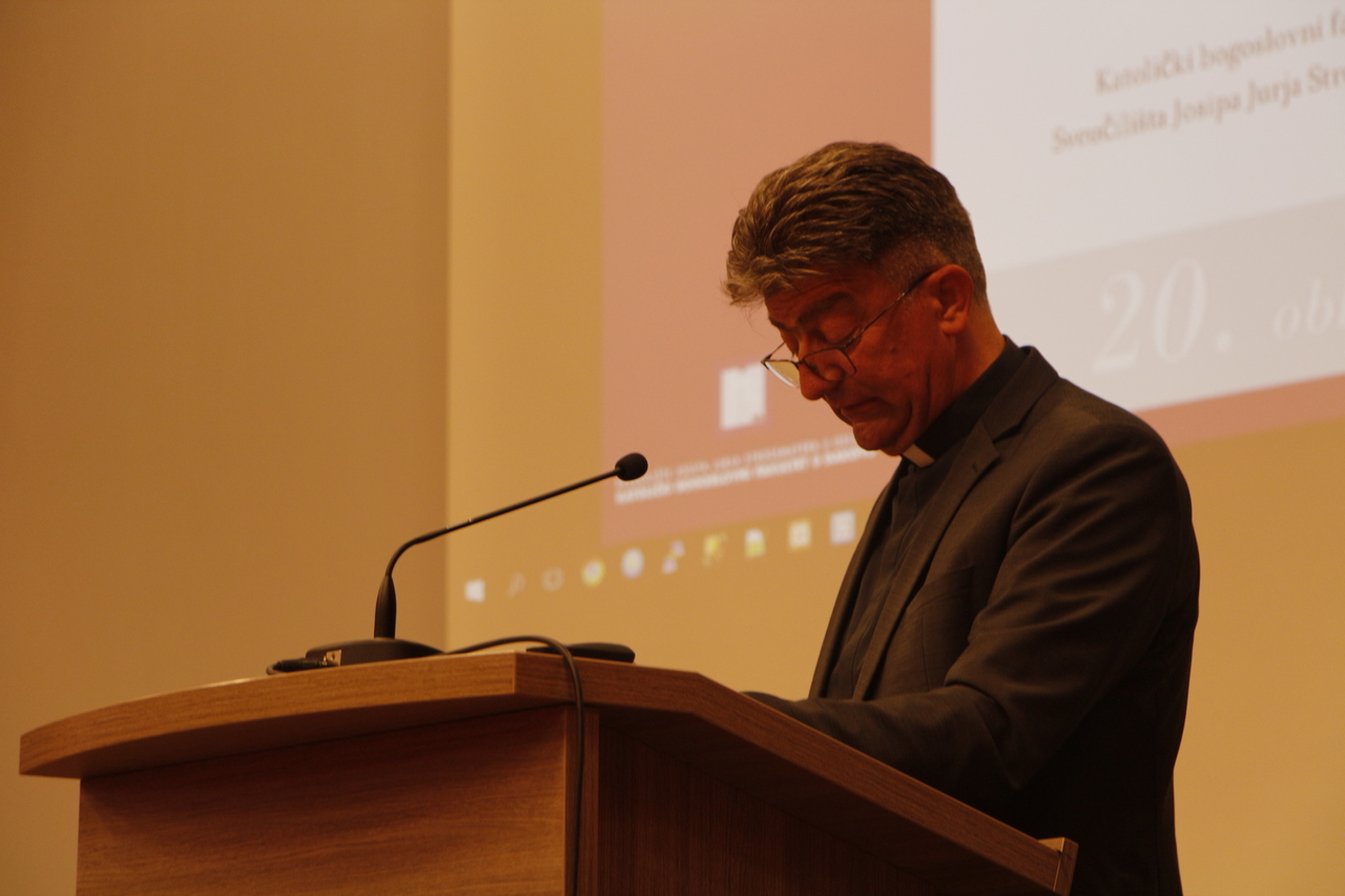 Već u uvodnom dijelu, dekan izv. prof. dr. sc. Ivica Pažin podsjetio je na svečanu akademiju održanu prethodne večeri, istaknuvši kako Fakultet, uza svu institucionalnu dimenziju, uvijek iznova svjedoči vlastitu transcendenciju i otvara prostor dijalogu vjere, znanosti i kulture. “Teologija nije samo znanstvena disciplina”, naglasio je, “nego i živo mjesto susreta društva, kulture i politike.” Okupljenima je poželio plodonosan dan, potičući ih na zajedničko razmišljanje upravo u duhu obljetnice.