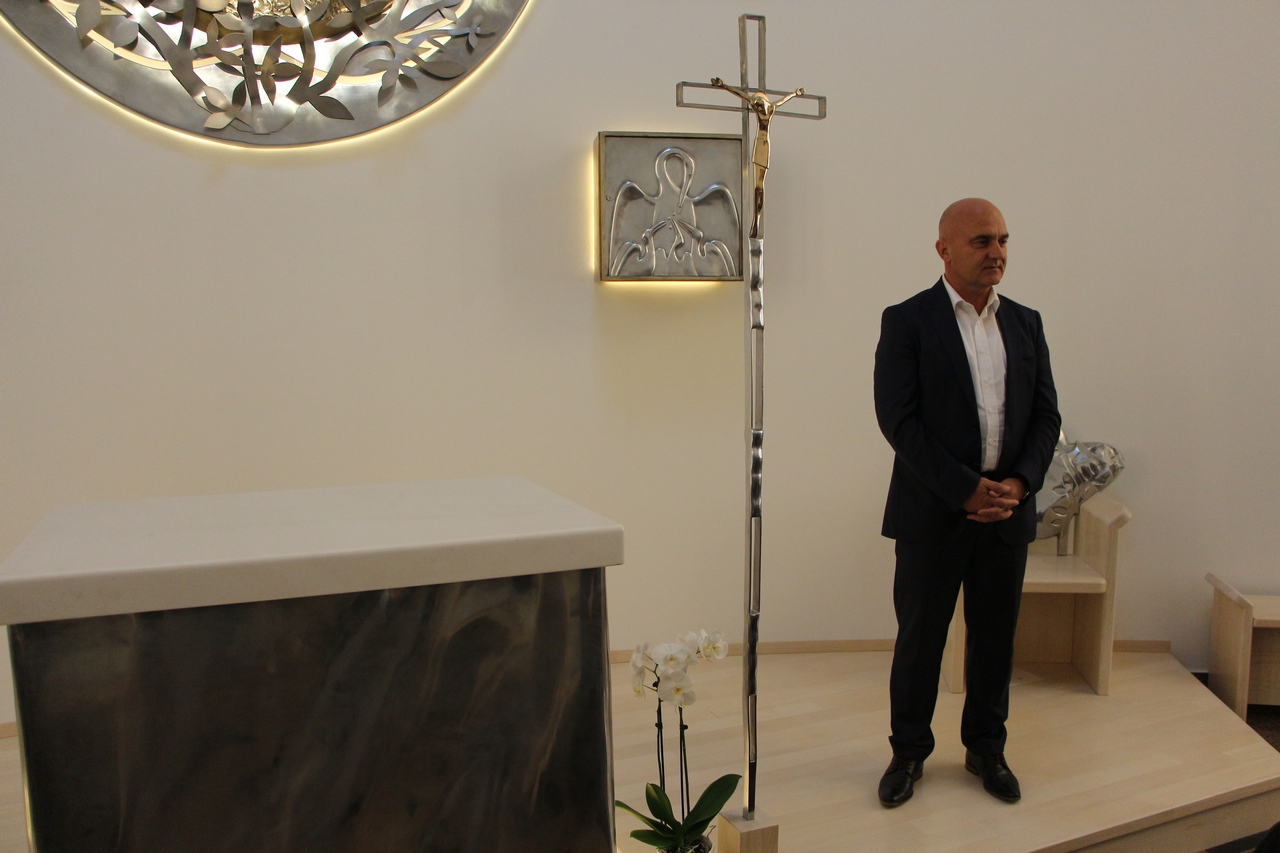 A onda se Damir, poput pravoga demiurga, odnosno poput božanske mudrosti iz Staroga zavjeta, doslovno razigrao pred tim mislima. Razigrano je donosio skice, svoje misli, svoje „natuknice“ koje su bile neka vrsta otjelovljivanja svetopisamskih i teoloških ideja u svijetu. I svaki sam put ostao zapanjen, pogođen i iznenađen stvaralačkim, razigranim umom i djelom Damirovim: izbor materijala (aluminij, bronca), igra s grmom i grančicama od reljefa pa sve do svijećnjaka na oltaru. A da ne spominjem ovaj predivni procesijski križ koji me doslovno bacio u ekstazu jer je tako nježan, plameno plemenit u svojem izričaju. Iznenađenja su se nastavila, kamena ambonska i oltarna ploča, koju smo obojica nazvali šećernom, ma krušnom, i koju bismo najradije doslovno jeli koliko je lijepa, i koja je trebala cijelomu prostoru kapelice opet podariti nježnost gorućega grma, nježnoga Božjeg plamena ljubavi. Evanđelisti nas podsjećaju da do Očeva oblaka dolazimo jedino po Božjoj riječi, Pismu. Nebeski evanđelisti na oblacima su poput anđela, koje ne smijemo zaboraviti u liturgiji, jer nas oni svojom čistoćom doslovno otimaju za nebeski, božanski svijet. A onda uvođenje moderne tehnike rasvjete, koja je opet nenametljiva, ljupkih klupa, toplih prozora koji nas blago žele odvojiti od ovoga svijeta kako bismo se, oplemenjeni Bogom, ponovno u nj mogli vratiti.
