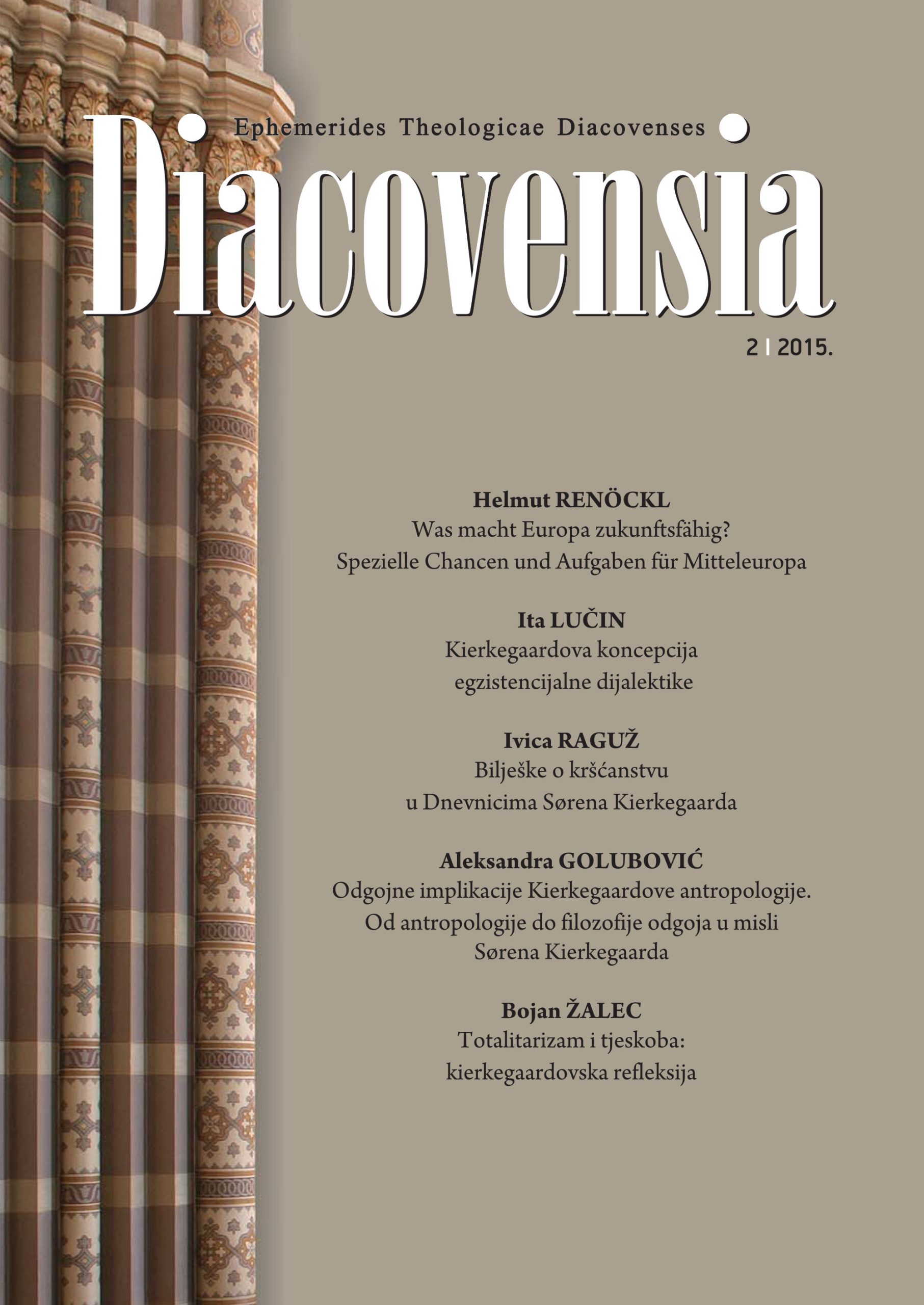 U ovome su broju objavljeni i članci proizašli iz znanstvenoga kolokvija o Sørenu Kierkegaardu održanome 12. ožujka na KBF-u u Đakovu. Tako se Ita Lučin s Filozofskoga fakulteta u Mostaru u svome članku Kierkegaardova koncepcija egzistencijalne dijalektike, bavi Kierkegaardovim dijalektičkim pristupom životu. Ivica Raguž u članku Bilješke o kršćanstvu u Dnevnicima Sørena Kierkegaarda otkriva kroz tri dijela (Kierkegaardovo shvaćanje kršćanstva, kritika protestantizma i žena) zanimljive misli danskoga filozofa koje mogu obogatiti i teologiju i filozofiju. Aleksandra Golubović s Filozofskoga fakulteta u Rijeci člankom Odgojne implikacije Kierkegaardove antropologije. Od antropologije do filozofije odgoja u misli Sorena Kierkegaarda pokazuje koje implikacije ima Kierkegaardova antropologija na filozofiju odgoja, kakvog odgajatelja i koje posebne metode zastupa Danac te položaj Boga kao glavnog odgajatelja u cjelokupnoj slici. Prolazeći kroz misao kod nas malo poznatoga C. K. Bellingera, u zadnjem članku ovoga broja, Totalitarizam i tjeskoba: kierkegaardovska refleksija, Bojan Žalec s Bogoslovnoga fakulteta u Ljubljani pokazuje kako nam bavljenje Kierkegaardom pomaže razumjeti društveni i politički život, posebno opasne totalitarne režime, koji, kierkegaardovskim rječnikom govoreći, osciliraju između tjeskobe nad dobrim i tjeskobe nad zlim.