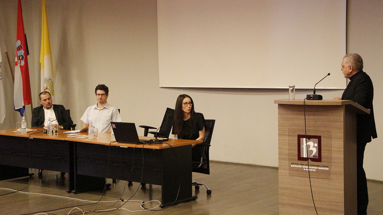 Prvo izlaganje na temu „Od Bosanske biskupije do Đakovačko-osječke nadbiskupije“ održao je doc. dr. sc. Grgo Grbešić. Istaknuo je najvažnije događaje i osobe u povijesti Đakovačko-osječke nadbiskupije, prvotno Bosanske biskupije, koja je osnovana između 1060. i 1075. godine u Brdu kod Sarajeva. Bosanski biskupi su prešli u Đakovo oko 1250. Krajem 14. stoljeća bosanski biskup je gotovo izgubio ovlasti nad biskupijom južno od rijeke Save. Pad Bosne 1463. kao i pad Slavonije 1536. pod tursku vlast presudni su događaji u povijesti Bosanske biskupije. Oslobođenjem Slavonije od Turaka godine 1687. Bosanska biskupija je u duhovnom i materijalnom smislu gotovo krenula od nule. U teritorijalnom smislu zauzimala je Đakovo i mali prostor oko Đakova. U 18. stoljeću proširivala je svoje granice, a broj vjernika je porastao sa 35.000 na 100.000. Ujedinjenjem sa Srijemskom biskupijom god. 1773. mijenja naziv u Bosansku ili Đakovačku i Srijemsku biskupiju. Najveći bosanski biskup bio je J. J. Strossmayer. Predavač je ukazao na razdoblje Domovinskoga rata koje je biskupiji donijelo velike ljudske žrtve i materijalna razaranja te podsjetio na 2008. godinu, kada se Srijemska biskupija osamostaljuje, a Đakovačka ili Bosanska biskupija dobiva naziv Đakovačko-osječka nadbiskupija.