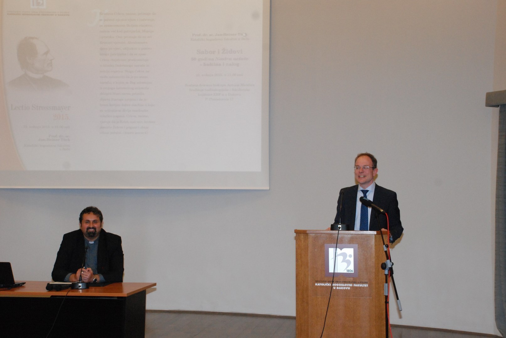U organizaciji Katoličkoga bogoslovnog fakulteta u Đakovu održano je 21. svibnja 2015. godine predavanje «Sabor i Židovi. 50 godina Nostra aetate – baština i nalog», prof. dr. sc. Jana-Heinera Tücka s Katoličkoga bogoslovnog fakulteta Sveučilišta u Beču (Katholisch-Theologische Fakultät, Universität Wien). Ovo vrijedno predavanje prvo je u nizu Lectio Strossmayer, predavanjâ koja će svake godine na našemu fakultetu održati ugledni mislioci iz inozemstva i koja imaju za cilj, kako je to u uvodnom obraćanju naznačio dekan, prof. dr. sc. Ivica Raguž, slijediti Strossmayerov duh. Između ostaloga, dekan je istaknuo da će se predavanja baviti gorućim problemima današnjice i nastojati ih teološki promisliti. Lectio tako, na skroman način, izražava težnju našega fakulteta da pronese ime velikana hrvatske povijesti Josipa Jurja Strossmayera u drugim crkvama, kulturama i društvima.