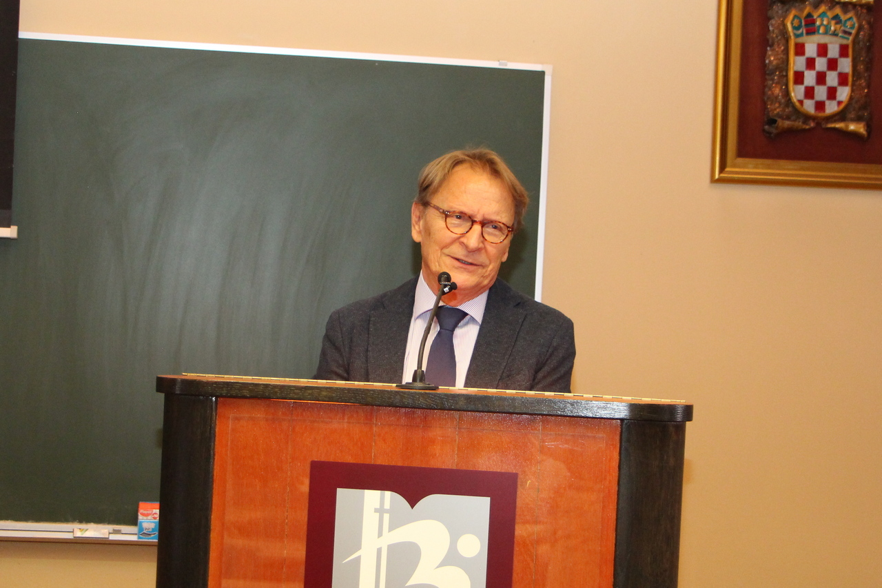 Prvo predavanje, pod naslovom „Umjetna inteligencija i smisao napretka: između inovacije i humanosti“održao je akademik Bojan Jerbić. Jerbić je istaknuo kako umjetna inteligencija nije samo tehnološki, nego i ontološki, moralni i kulturni izazov koji duboko mijenja razumijevanje čovjeka. UI postaje „nova električna energija“ četvrte industrijske revolucije, prožimajući sve sustave i brišući granice između fizičkog, digitalnog i biološkog svijeta. Naglašeno je da stroj ne misli, već računa – dok je ljudsko mišljenje povezano s iskustvom, emocijama, sviješću i svrhovitošću. Pitanje može li stroj posjedovati svijest ostaje otvoreno, a različite filozofske teorije nude suprotstavljena tumačenja. UI sustavi, uključujući velike jezične modele, mogu biti moćni, ali i skloni halucinacijama, pristranostima i netransparentnim odlukama. Ubrzani razvoj umjetne inteligencije donosi brojne rizike – od sigurnosnih i etičkih do ekonomskih i društvenih. Posebno je istaknuta potreba za upravljivošću UI sustava kroz načela odgovornosti, objašnjivosti, točnosti, revizivnosti i pravednosti. Roboetika postaje ključno područje jer složeni autonomni sustavi mogu dovesti do moralno upitnih odluka. Razvoj UI mijenja strukturu rada jer robotika zamjenjuje fizičku, a UI intelektualnu i kreativnu radnu snagu. Ključna poruka predavanja glasi: budućnost neće pripasti strojevima, nego ljudima koji razumiju svoju jedinstvenu humanost i zadržavaju ono što strojevi nikada ne mogu imati – moral, empatiju i svijest o smislu.