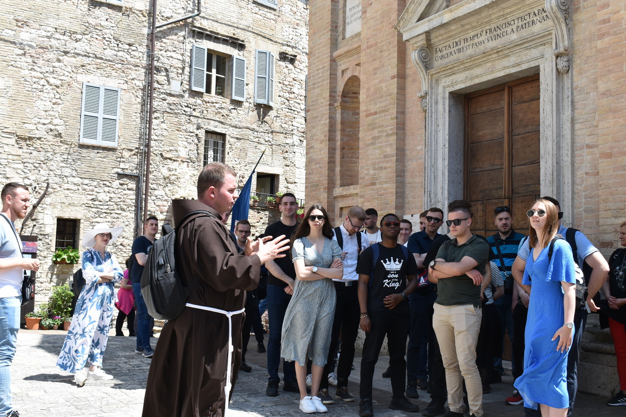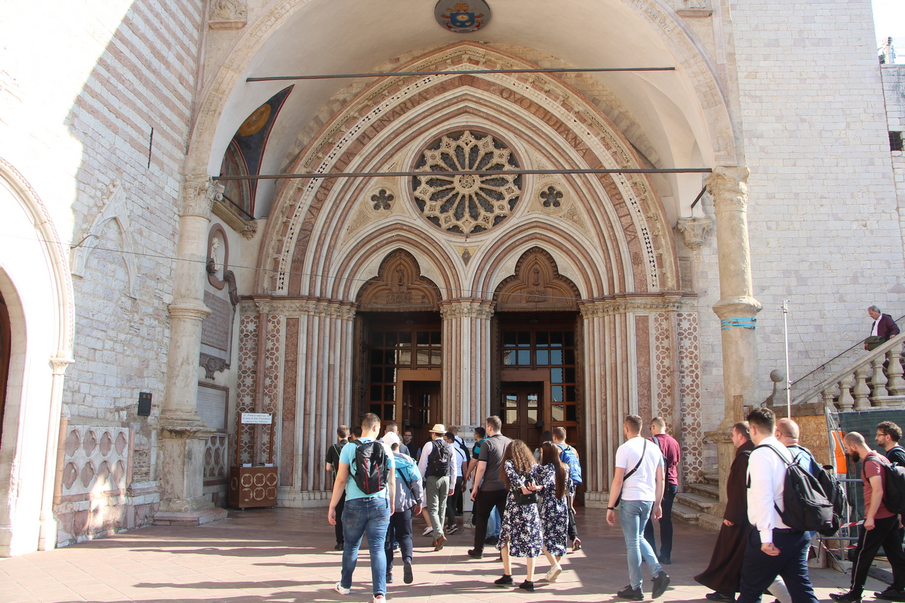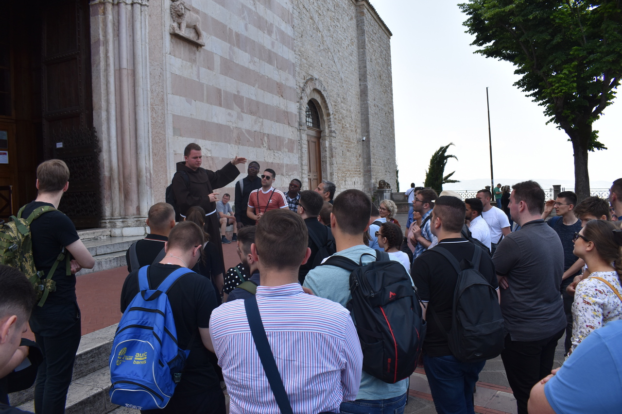 Sljedeći je dan započeo molitvom jutarnje, a kod Porcijunkule nas je dočekao fra Antonio Gašić, franjevac Bosne Srebrne, trenutno na studiju pastoralne teologije u Rimu. On nam je bio vodič oba dana u Asizu. Fra Antonio nije nam samo pokazivao i objašnjavao umjetničke znamenitosti Asiza, nego nam je ponajprije teološki i duhovno tumačio život sv. Franje. Svaka crkva bila je nova meditacija o sv. Franji. U Asizu smo prvoga dana imali sv. misu na grobu sv. Franje koju je predvodio v. d. dekana prof. dr. sc. Ivica Raguž. Pozivajući se na evanđelje dana, naglasio je kako svi mi možemo prenositi vjeru samo ako to činimo na dva način: da ju svjedočimo svojim životom, ali i u poniznosti. Tako nas evanđelist Ivan uvodi u razmatranje o svetome Franji. Dekan je istaknuo pet važnih misli o sv. Franji. Prva je ta da je za svetoga Franju daleko gore zlouporabiti krepost nego biti bez kreposti. Kaže da čovjek kada čini dobro, očekuje i želi pohvalu, a Franjo kaže da bi radije bio kuđen nego pohvaljen. Tako se druga misao nastavlja na prvu, a to je da životopisac svetoga Franje, kada govori o Franjinoj poniznosti, naglašava da je zahvaljivao za sve u životu, ali je istovremeno sebe smatrao najvećim grešnikom. Tako mu se poniznost očitovala i u vanjskome držanju. No ona nije bila samo u vanjskome držanju, već i u mišljenju. Sebe je uvijek prosuđivao u najvećoj poniznosti. I u trećoj misli, Dekan je naglasio kako Franjo nije podnosio isprazne riječi. Onima koji su govorili isprazne riječi, Franjo je savjetovao da izmole Očenaš, da ljube noge onome koje su uvrijedili svojim riječima, ali da čak stave i izmet na svoja usta. Četvrto, sv. Franjo se i rado družio s gubavcima, siromasima, bolesnima i nemoćnima te je time htio da se učimo poniznosti, sebedarju, lomljenju vlastite moći koja se očituje u tomu da tražimo društvo samo s moćnim ljudima ili onima koji nam mogu uzvratiti. Peto, kada su ga hvalili, tada je sv. Franjo sebe uspoređivao s ikonom: kao što drvo na ikoni nosi sliku Isusa i Blažene Djevice Marije i ostaje samo drvo, tako je i sv. Franjo samo drvo, i manje od drveta ikone, drvo koje nosi Isusa Krista i Blaženu Djevicu Mariju. Sve što ima, ne pripada njemu, nego Isusu i Mariji. I to je poniznost. Dekan nas je pozvao da, dok budemo razgledavali freske u bazilici sv. Franje, i sami sebe prepoznamo kao obično drvo, običan zid, ali drvo, zid, na kojemu će biti naslikana ikona Isusa Krista i Blažene Djevice Marije. Nakon razgledavanja bazilike, slijedio je obilazak rodne kuće sv. Franje, gdje smo izmoliti srednji čas te potom se pomolili u crkvi sv. Damjana, a nakon toga slobodno vrijeme za razgledavanje Asiza. Nakon večere, svi smo se uputili u Porcijunkulu gdje je bila zajednička molitva krunice i procesija sa svijećama.