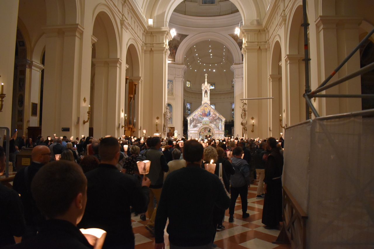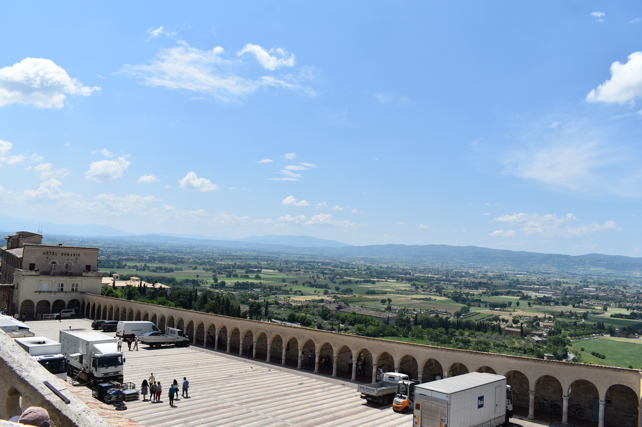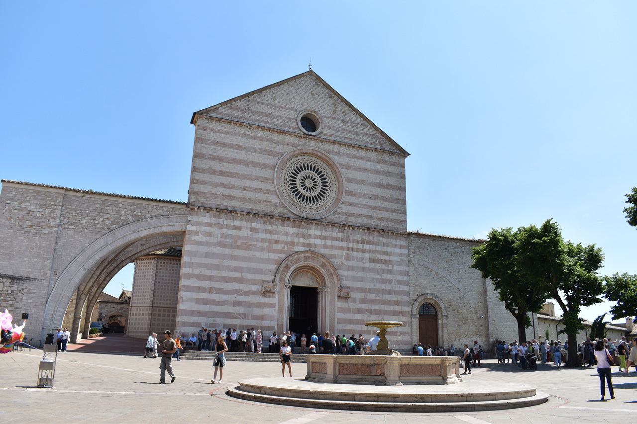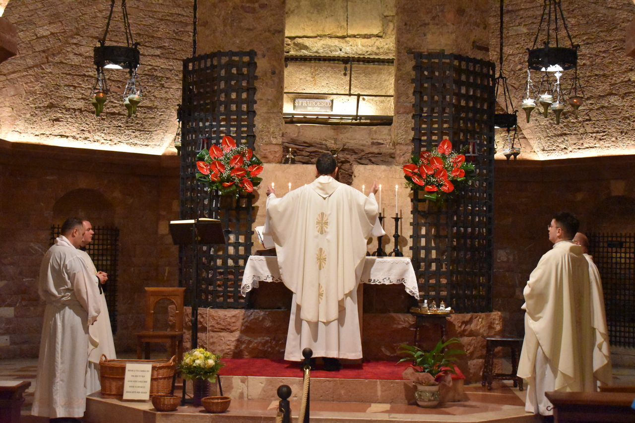 Sljedeći je dan započeo molitvom jutarnje, a kod Porcijunkule nas je dočekao fra Antonio Gašić, franjevac Bosne Srebrne, trenutno na studiju pastoralne teologije u Rimu. On nam je bio vodič oba dana u Asizu. Fra Antonio nije nam samo pokazivao i objašnjavao umjetničke znamenitosti Asiza, nego nam je ponajprije teološki i duhovno tumačio život sv. Franje. Svaka crkva bila je nova meditacija o sv. Franji. U Asizu smo prvoga dana imali sv. misu na grobu sv. Franje koju je predvodio v. d. dekana prof. dr. sc. Ivica Raguž. Pozivajući se na evanđelje dana, naglasio je kako svi mi možemo prenositi vjeru samo ako to činimo na dva način: da ju svjedočimo svojim životom, ali i u poniznosti. Tako nas evanđelist Ivan uvodi u razmatranje o svetome Franji. Dekan je istaknuo pet važnih misli o sv. Franji. Prva je ta da je za svetoga Franju daleko gore zlouporabiti krepost nego biti bez kreposti. Kaže da čovjek kada čini dobro, očekuje i želi pohvalu, a Franjo kaže da bi radije bio kuđen nego pohvaljen. Tako se druga misao nastavlja na prvu, a to je da životopisac svetoga Franje, kada govori o Franjinoj poniznosti, naglašava da je zahvaljivao za sve u životu, ali je istovremeno sebe smatrao najvećim grešnikom. Tako mu se poniznost očitovala i u vanjskome držanju. No ona nije bila samo u vanjskome držanju, već i u mišljenju. Sebe je uvijek prosuđivao u najvećoj poniznosti. I u trećoj misli, Dekan je naglasio kako Franjo nije podnosio isprazne riječi. Onima koji su govorili isprazne riječi, Franjo je savjetovao da izmole Očenaš, da ljube noge onome koje su uvrijedili svojim riječima, ali da čak stave i izmet na svoja usta. Četvrto, sv. Franjo se i rado družio s gubavcima, siromasima, bolesnima i nemoćnima te je time htio da se učimo poniznosti, sebedarju, lomljenju vlastite moći koja se očituje u tomu da tražimo društvo samo s moćnim ljudima ili onima koji nam mogu uzvratiti. Peto, kada su ga hvalili, tada je sv. Franjo sebe uspoređivao s ikonom: kao što drvo na ikoni nosi sliku Isusa i Blažene Djevice Marije i ostaje samo drvo, tako je i sv. Franjo samo drvo, i manje od drveta ikone, drvo koje nosi Isusa Krista i Blaženu Djevicu Mariju. Sve što ima, ne pripada njemu, nego Isusu i Mariji. I to je poniznost. Dekan nas je pozvao da, dok budemo razgledavali freske u bazilici sv. Franje, i sami sebe prepoznamo kao obično drvo, običan zid, ali drvo, zid, na kojemu će biti naslikana ikona Isusa Krista i Blažene Djevice Marije. Nakon razgledavanja bazilike, slijedio je obilazak rodne kuće sv. Franje, gdje smo izmoliti srednji čas te potom se pomolili u crkvi sv. Damjana, a nakon toga slobodno vrijeme za razgledavanje Asiza. Nakon večere, svi smo se uputili u Porcijunkulu gdje je bila zajednička molitva krunice i procesija sa svijećama.
