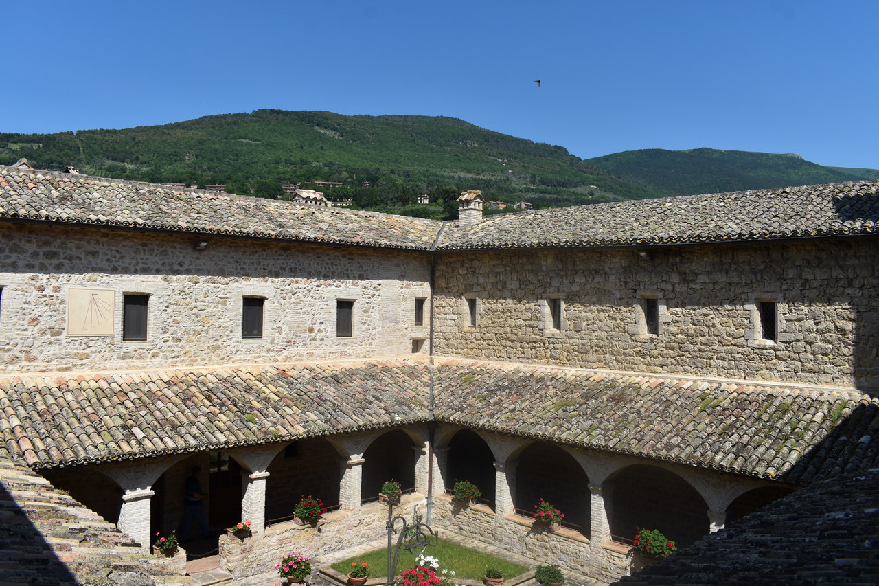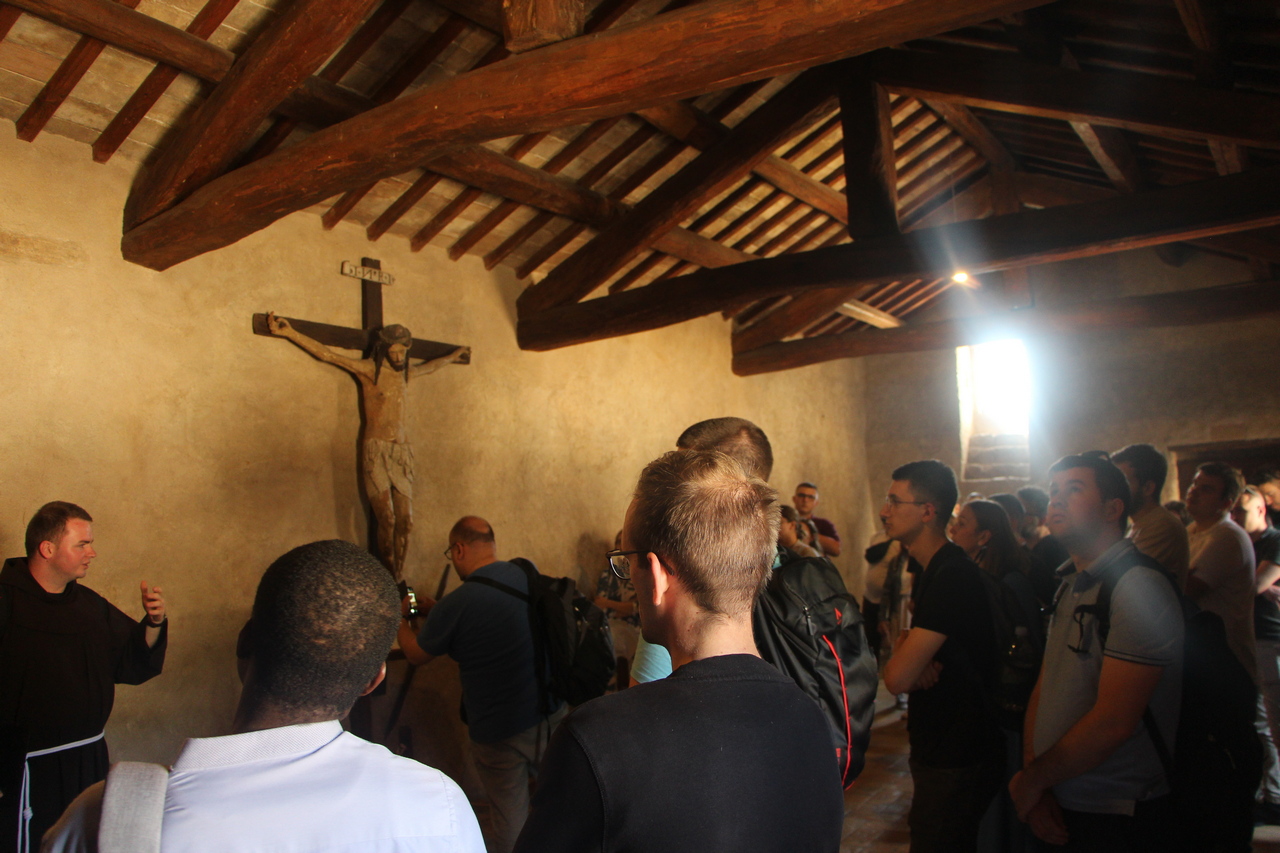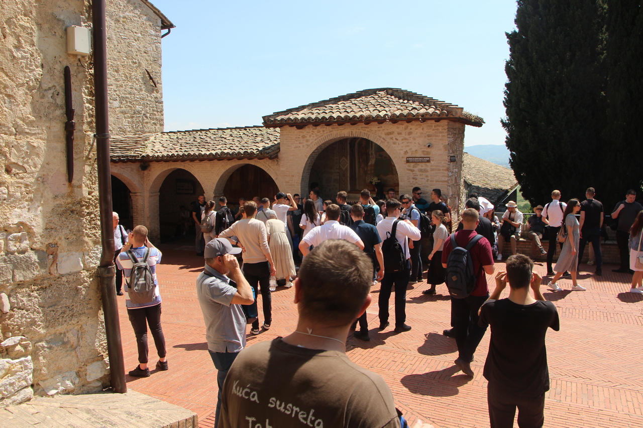 Nedjelju smo započeli obilaskom Porcijunkule i jutarnjom molitvom. Potom smo se zaputili u u Asiz, u crkvu sv. Klare, posjetili smo i svetište svlačenja svetoga Franje, grob bl. Karla Acutisa, gdje smo izmolili srednji čas, a potom smo obišli rodnu kuću sv. Klare i katedralu sv. Rufina. Nakon okrjepe, zaputili smo se pješice do Samotišta Carceri. Na putu je bila mogućnost svete ispovijedi te se većina studenata putem ispovjedila, duhovno naznačujući da se u ispovijedi uspinju dušom na brdo susreta s Bogom, kao što je to činio sv. Franjo u Samotištu. U Samotištu smo slavili sv. misu koju je predvodio izv. prof. dr. sc. Boris Vulić. Svoju je homiliju započeo tumačenjem prve Crkve koja se okupljala oko apostola i naglasio kako smo i mi sada svi skupljeni na istome mjestu kao i prvi učenici. Mi smo ta Crkva koja je ustanovljena po Petru i apostolima. Isto tako, rekao je profesor, gdje je zajedništvo, ondje je i Duh Sveti. U svakoj svetoj misi vidi se najljepši izričaj zajedničke Crkve – vjernici na zemlji, anđeli i arkanđeli, svete duše, trpeće duše u čistilištu i sam Trojedini Bog. No, profesor je naglasio i da moramo naučiti biti sami kako bismo mogli biti dio zajednice, ud Kristov. Riječ „carcere“ znači sobica, ali i zatvor, ćelija. Tako ovaj prvi smisao označava osobu koja je u zajedništvu s Bogom, ona je radosna osoba, dok drugi smisao pojma obuhvaća osobu koja nije znala za zajedništvo sa drugima i sa Bogom pa je to žalosna, zatvorena osoba. Svi mi u sebi imamo ćelije, mjesto gdje smo sami, gdje promišljamo o Bogu, o nama, o drugima, a onda izlazimo iz tih ćelija i odlazimo u zajednice. Važno je da su naše ćelije uvijek otvorene djelovanju Duha Svetoga. Nakon sv. mise, obasjani zalaskom sunca u Samotištu, izmolili smo i večernju molitvu te se pješice u šutnji i molitvi vratili u grad te smo imali slobodno vrijeme za druženje i razgledavanje.