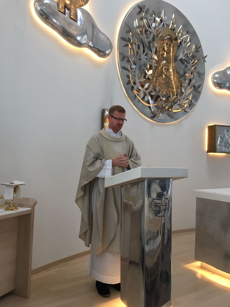 Nakon razgovora sa studentima, uslijedila je sveta misa koju je slavio velečasni Katačić u koncelebraciji sa prof. Matezovićem. U homiliji, vlč. Katačić osvrnuo se na navještenje opisano u Lukinu evanđelju. Ono je događaj poniznosti, skriven je, nitko za njega ne zna, a opet, ono je odlučujući događaj za povijest čovječanstva. Marijinim „da“ začet je Isus i njezin „da“ je i Isusov „da“. Sv. Ivan od Križa kaže da je Bog od samog trena začeća uzdigao Mariju u stupanj preobraženja. Novi zavjet, novi savez započinje anđeoskim pozdravom Mariji. Grčki izričaj „kaire“ – raduj se, nagoviješta kako se već ovdje vrata otkupljenja otvaraju čitavom čovječanstvu. Adam je pao u grijeh i osudio nas na smrt, a Krist, novi Adam, svojim posluhom otkupljuje nas od zaslužene kazne. Anđeo naviješta da Bog nije zaboravio obećanje da će izdići potomka Davidova kraljevstva, ali ovo Kraljevstvo nije izgrađeno na svjetovnoj moći, ne poznaje kraja jer u njemu kraljuje Bog. Umjetnici uglavnom prikazuju događaj utjelovljenja na način da Marija u kući moli, a anđeo dolazi s ljiljanom. Tako vidimo da Marija njeguje svoj duhovni život i ogleda se u Božjoj riječi, dok je ljiljan simbol čistoće. Dolazak Boga ne može se dogoditi van kuće, mora biti u molitvi. Isusovo je utjelovljenje novo ostvarenje zemaljskog raja kod nas u duši, Bog vraća dušu u svoj zagrljaj. Pomoć na putu sjedinjenja s Bogom su sakramenti pa će tako sveti župnik Arški reći da je oltar krilo Marijino gdje se neprestano začinje i rađa Bog. Svoju je homiliju zaključio zazivom da nas Bog već na zemlji učini dionicima svojega božanstva.