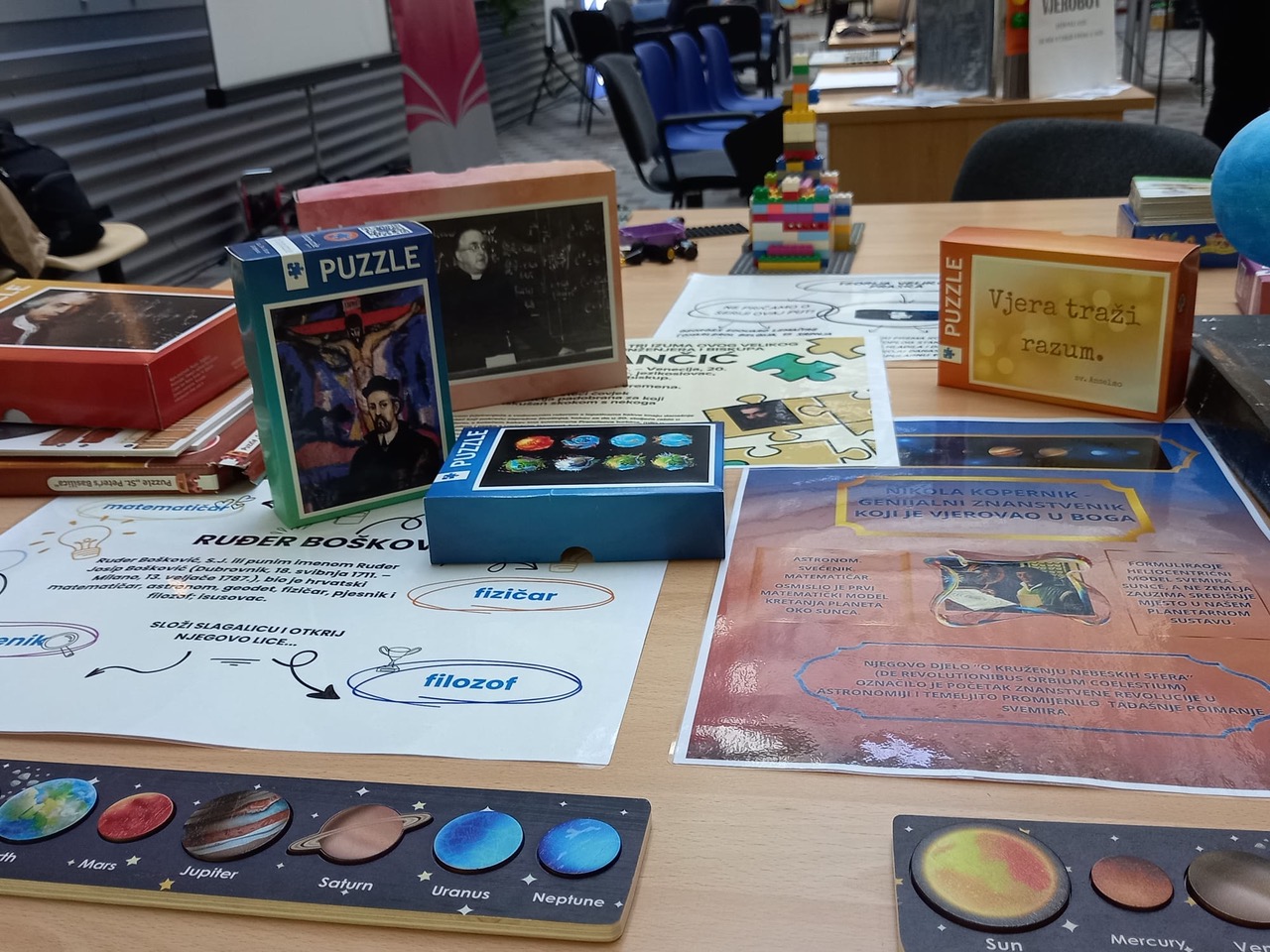 Kroz bogat i zanimljiv program, alumniji i studenti Fakulteta predstavili su neke od najistaknutijih svećenika-znanstvenika čiji su radovi značajno obilježili povijest znanosti. Posjetitelji su kroz slagalice planeta imali priliku upoznati život i djelo Nikole Kopernika, svećenika koji je promijenio naše poimanje svemira, te doznati kako je Georges Lemaître, također svećenik, prvi predložio teoriju Velikog praska.