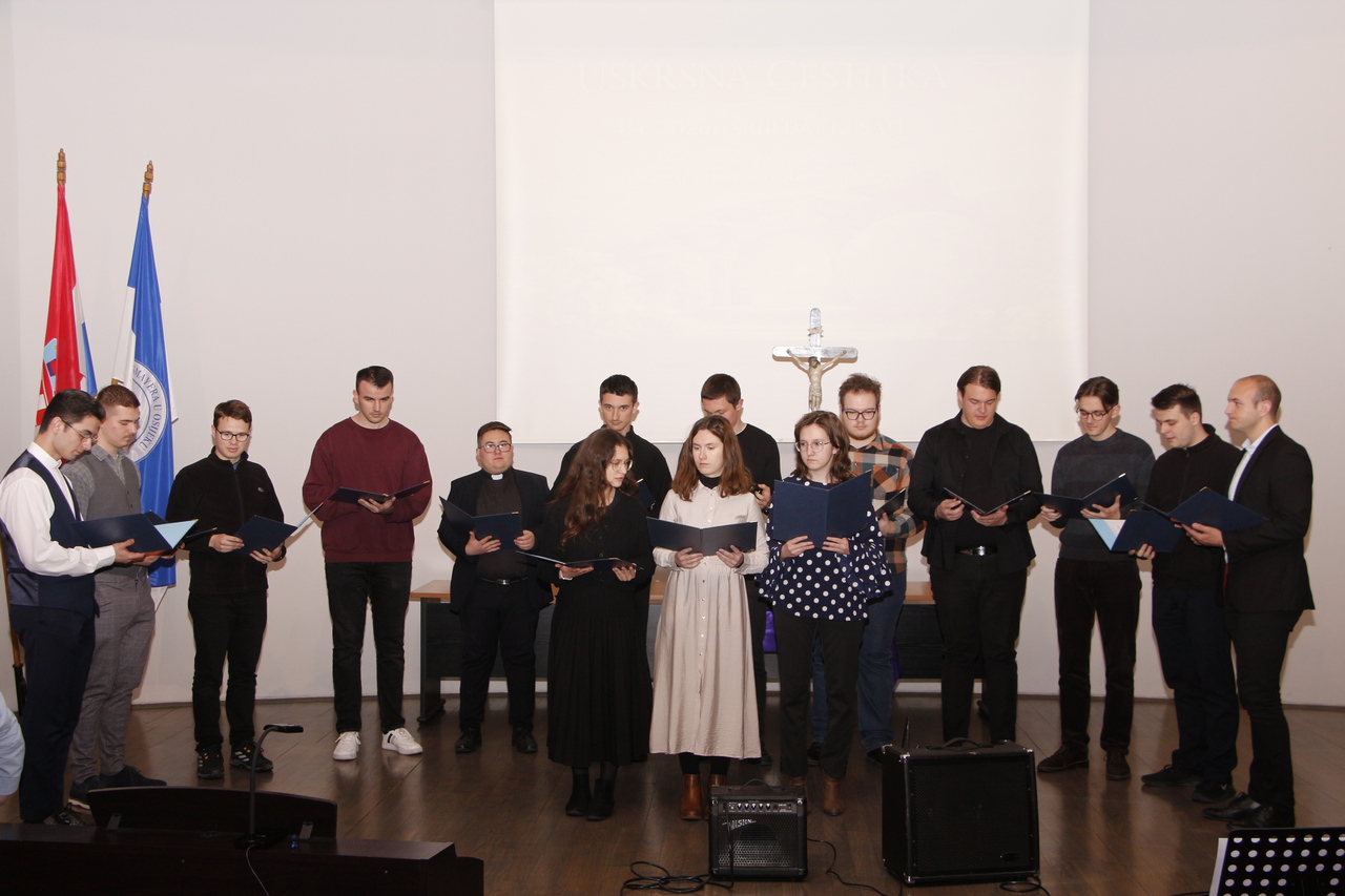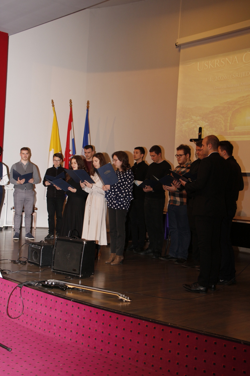 Svoje je obraćanje dodatno obogatio liturgijskim izričajem, prisjećajući se antifone „Tvome križu klanjamo se, Gospodine“, ističući kako se upravo u križu rađa radost uskrsnuća koja obasjava cijeli svijet. Na samome kraju programa nastupio je zbor Katoličkog bogoslovnog fakulteta pod vodstvom maestra Ivana Andrića, koji je izveo skladbe „Hosana Davidovu Sinu“ i „Kyrie“, čime je uskrsna čestitka svečano privedena kraju. Potom je uslijedio prigodni domjenak za sve sudionike.